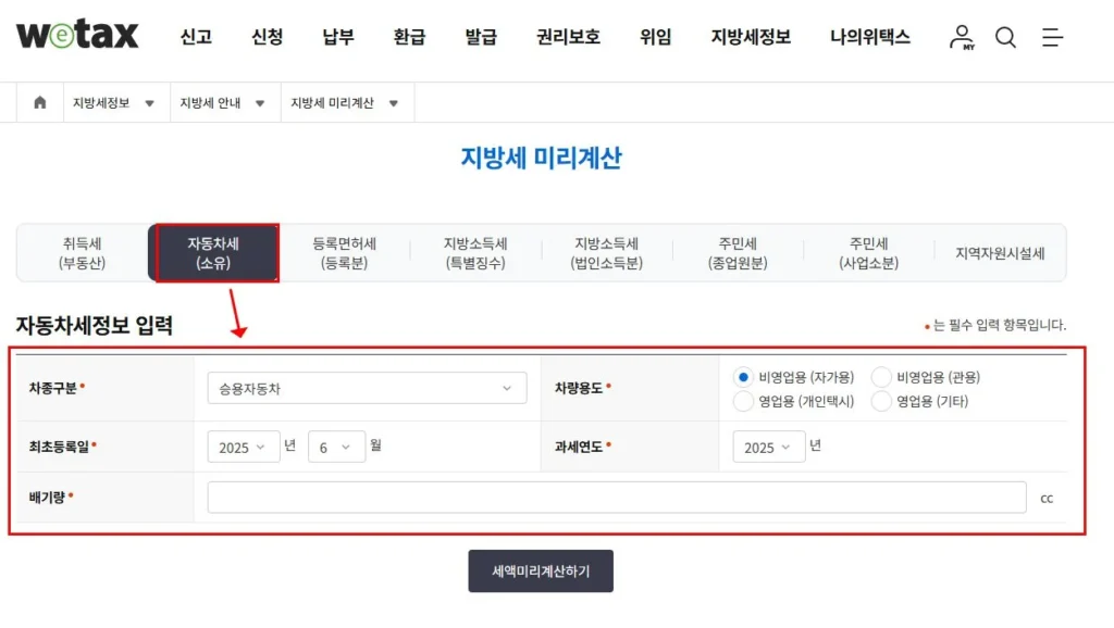 ‘위택스(www.wetax.go.kr)’에 접속 후 ‘자동차세 계산기’ 혹은 ‘지방세 미리 계산’에서 자동차세 선책 후 이용하면 차량 정보(배기량, 등록일, 연식 등)를 입력해 정확한 자동차세를 미리 확인할 수 있습니다.